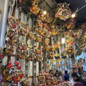 酉の市は、商売繁盛を願う人々が集まる江戸時代から続く伝統行事で、「熊手」を授かる日でもあります。境内に入ると威勢のいい掛け声が響き、きらびやかな熊手がずらりと並びます。初めて訪れる社長も、そのエネルギーにすぐに引き込まれていました。