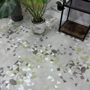 今回の床材は、やわらかいグレーをベースに、グリーンや白の小さな模様が散りばめられたデザイン。